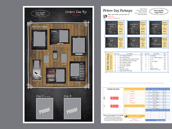 Proof Plans are printed after an event is photographed. This is an order form that contains product marketing images with the actual student’s images in the products. Your packages and products available for purchase are listed along with studio contact information and a payment envelope is included for checks or cash.